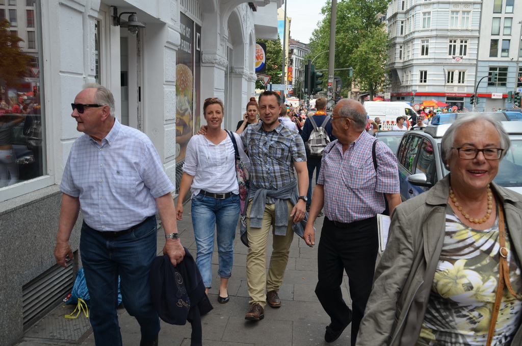 | ... ja, es geht zu Fuß zum Hafen, da ja Schlagermove ist und der Bus nicht mehr die Reeperbahn befahren darf. |