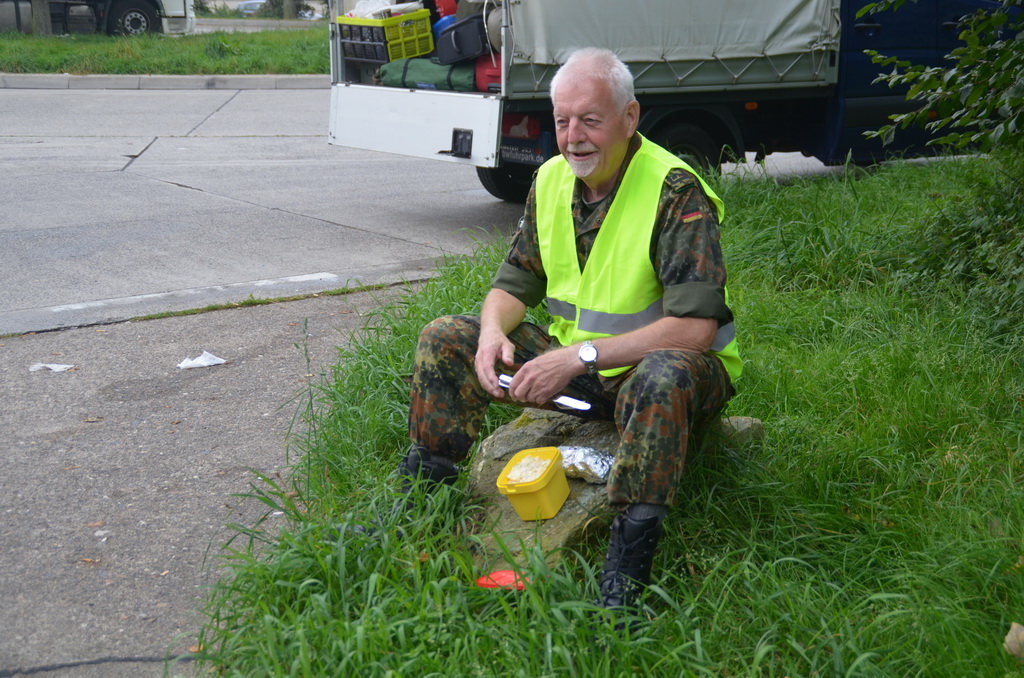 | Klaus, unser Kommandoführer, zeigt allen, dass die Frontscheibe auch zu reinigen geht. |