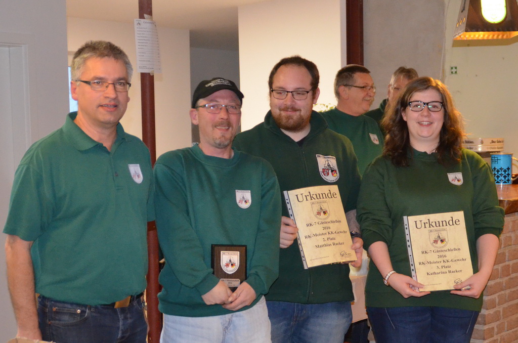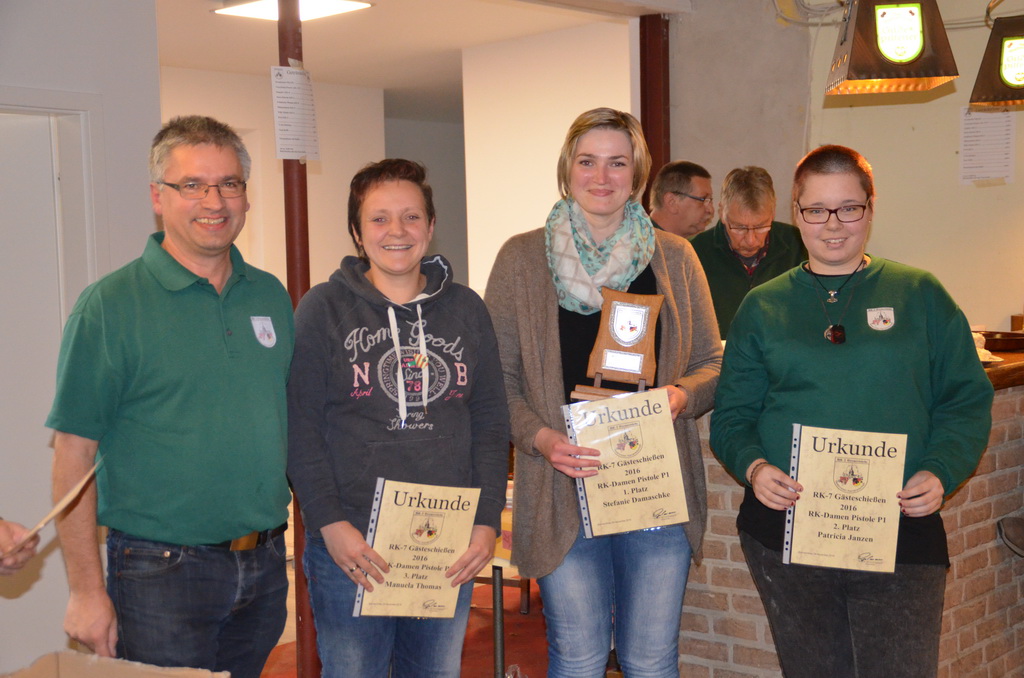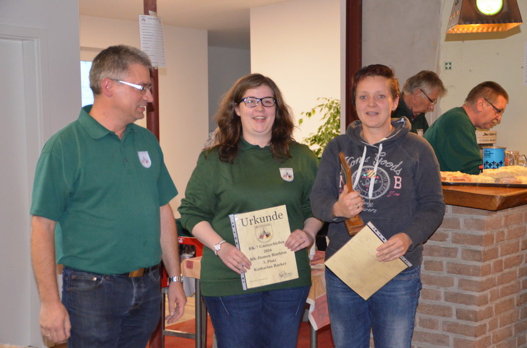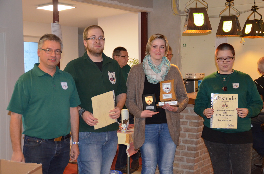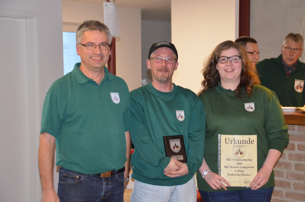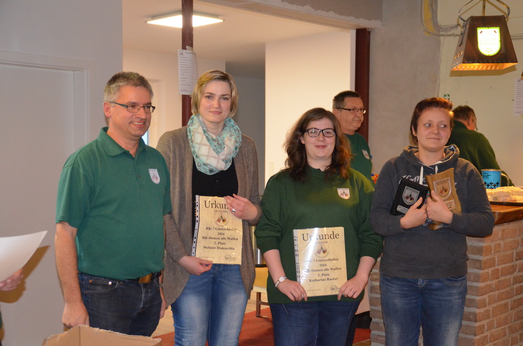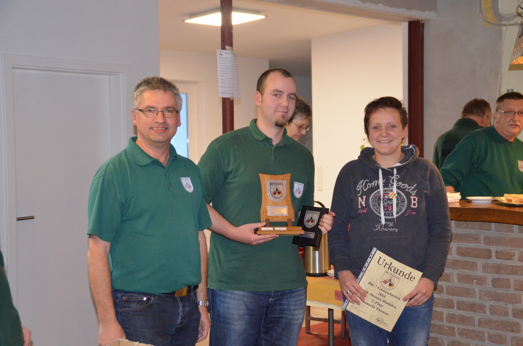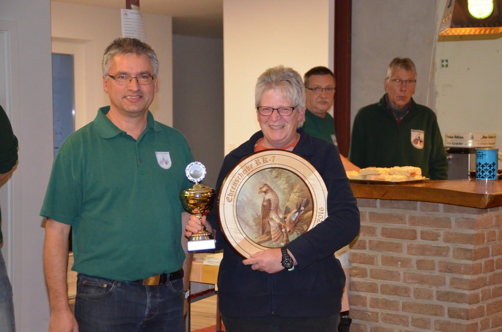 | Manuela Thomas siegte bei der RK-Internen Meisterschaft RK-Meister aller Waffen und bekam aus den Händen des Stifters dieses Wanderpokals, Enno Rugen, diesen überreicht. |