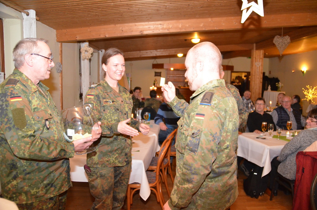 die Musikschau der Nationen in Bremen verlost werden. Als Glücksfee hat die Kompaniechefin der 9./FschJgRgt 31, OFA Ildiko Tech, alles gegeben. |