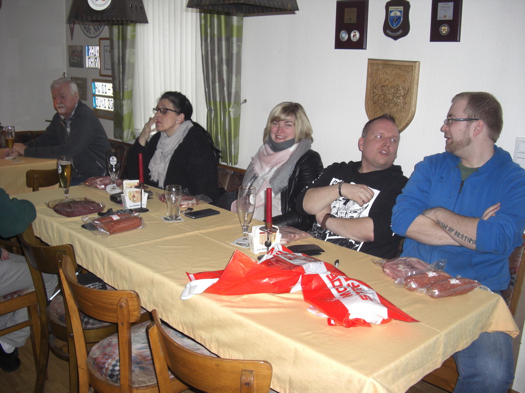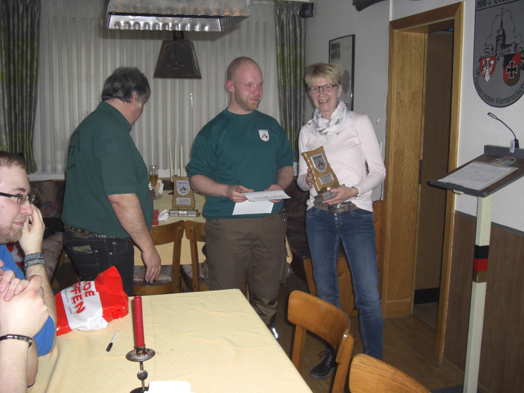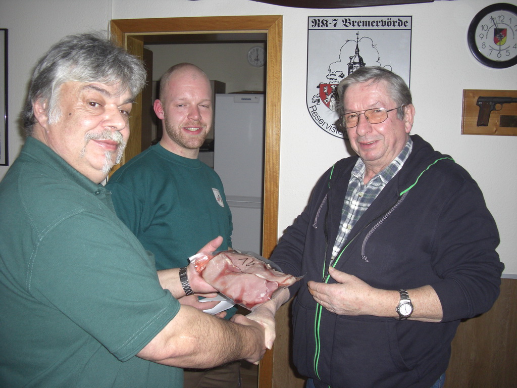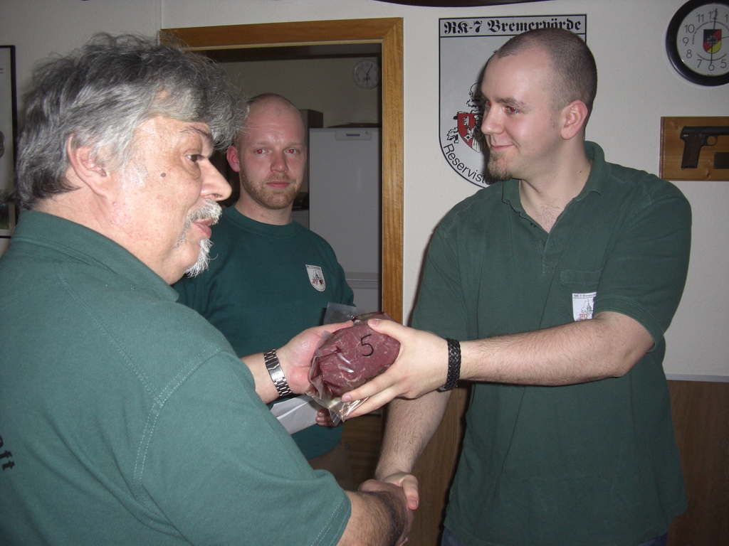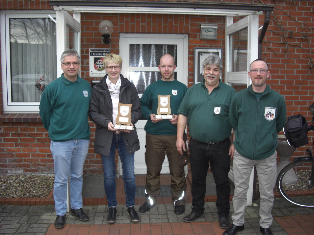 | Die Sieger Christine Lehmann bei den Damen, Matthias Raeker(auf dem Bild sein Bruder Stefan) sowie die Schießwarte, Ingo Stolzke, Oliver Parge und der Vorsitzende Kai-Uwe Engelmann(links). |