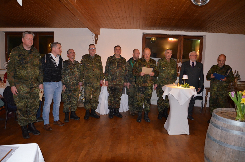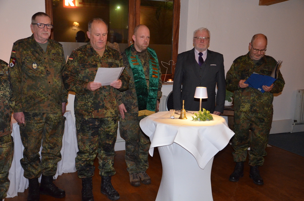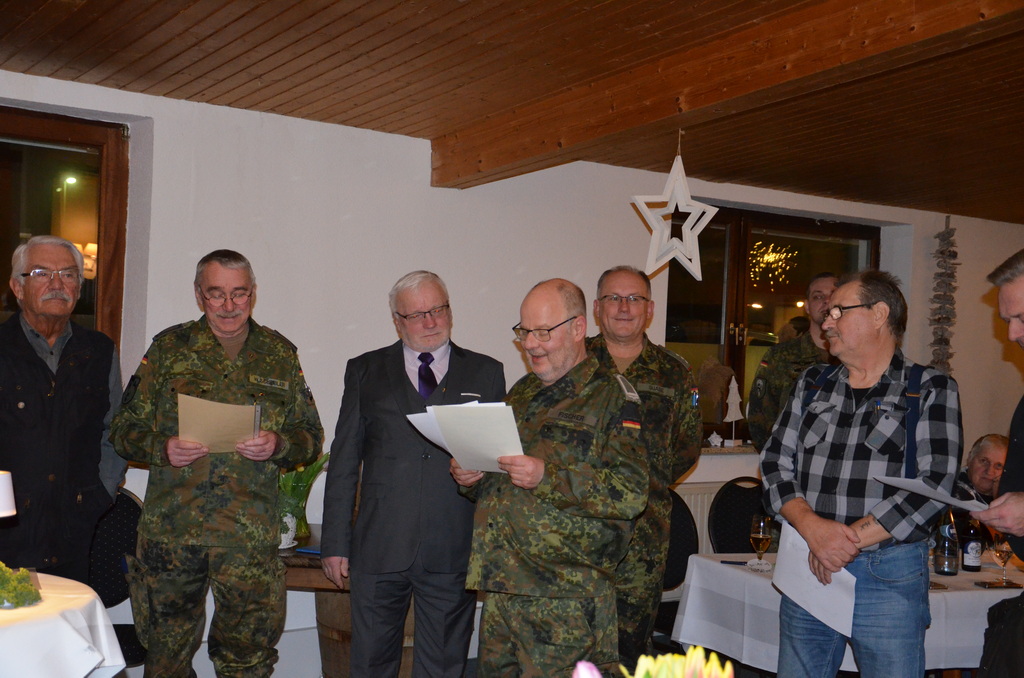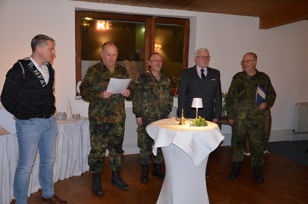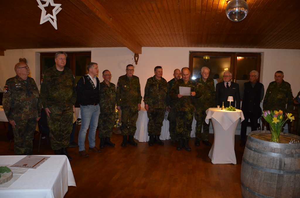 ... bevor er mit den Ehrungen von verdienten Mitgliedern begann. Hier konnte OGefr d.R. Malte Alexander Busch für 10-jährige aktive Mitarbeit im Verband geehrt werden... |