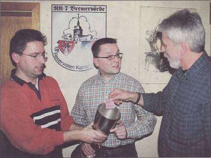 Auch das hat Tradition in der Reservistenkameradschaft: Schriftführer Kai-Uwe Engelmann (links) und Kassenführer Stephan Grotheer (Mitte) verkaufen Lose, mit denen die Mitglieder einen Jahresbeitrag gewinnen können. Foto: mg