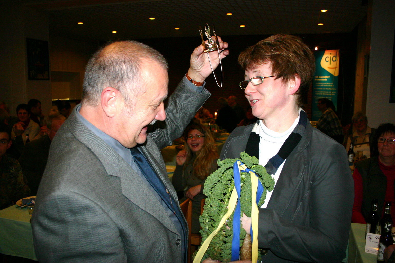 Kein Kohlessen ohne würdige Majestät: Klaus Schmidt verleiht Katrin Engelmann die äußeren Zeichen einer zünftigen Kohlkönigin.